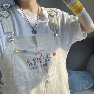 Embark on a journey in style with the Harajuku Overalls , inspired by Tokyo's vibrant Jingumae district . These overalls are distinguished by their muted beige color , enhanced with kawaii inscriptions that capture the essence of modern Japanese culture. With its fitted cut at the hips and flared legs, it offers a striking contrast that will leave no one indifferent.🎨